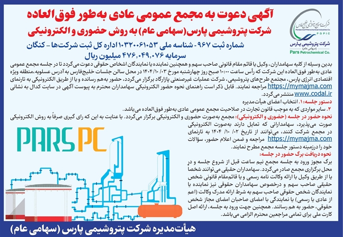 آگهی دعوت به مجمع عمومی عادی به طور فوق العاده شرکت پتروشیمی پارس