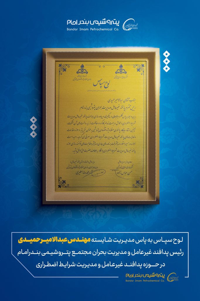در ارزیابی سالانه پدافند غیرعامل و مدیریت بحران منطقه ویژه اقتصادی پتروشیمی ماهشهر، پتروشیمی بندرامام موفق به کسب دو عنوان برتر شد.