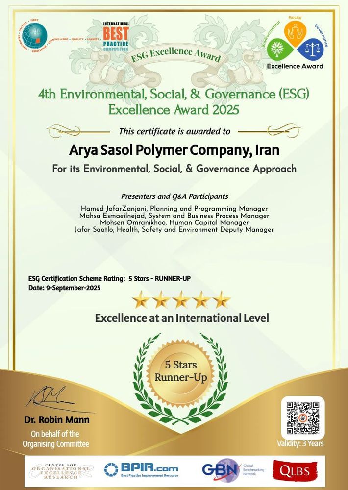 فرهنگ اقتصاد _ به نقل از روابط عمومی شرکت پلیمر آریاساسول، گواهینامه‌های چهارمین دوره جایزه تعالی پایداری (ESG) مبتنی بر حوزه­‌های محیط زیست، اجتماع و حاکمیت سال ۲۰۲۵ تحت نظارت مسابقه برترین تجارب بین‌المللی (IBPC) (IBPC 4th Environment, Social, Governance Excellence Award 2025) برای آریاساسول صادر شد.
