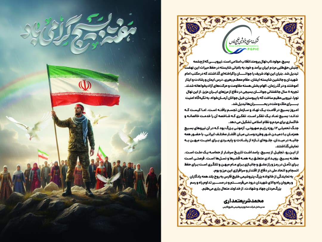 مدیرعامل شرکت صنایع پتروشیمی خلیج‌فارس در پیامی به مناسبت هفته بسیج، با بیان اینکه در دوران جنگ ۱۲ روزه تحمیلی جنگ تحمیلی، نیروهای بسیج هم‌زمان با دمیدن شور وطن‌دوستی میان اقشار مختلف ایرانی، با حضور همه‌جانبه در میدان، جلوه‌ای تازه از رشادت و پایمردی برای امنیت میهن به نمایش گذاشتند، بر حفظ انسجام و اتحاد ملی در دفاع از اقتدار و سرافرازی این مرزوبوم تأکید کرد.