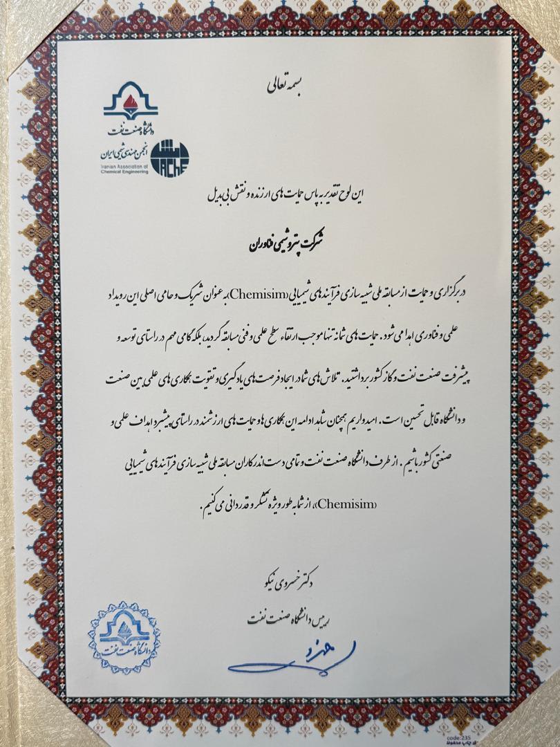 در آیین برگزاری نخستین دوره آموزشی شبیه‌سازی فرآیندی (Chemisim) که به‌همت دانشگاه صنعت نفت و با حمایت و پشتیبانی واحد توسعه و برنامه‌ریزی و (R&D) شرکت پتروشیمی فن‌آوران برگزار شد، از این شرکت به‌عنوان حامی اصلی رویداد تقدیر به‌عمل آمد و لوح سپاس و تندیس ویژه این دوره به مدیران شرکت اهدا گردید.