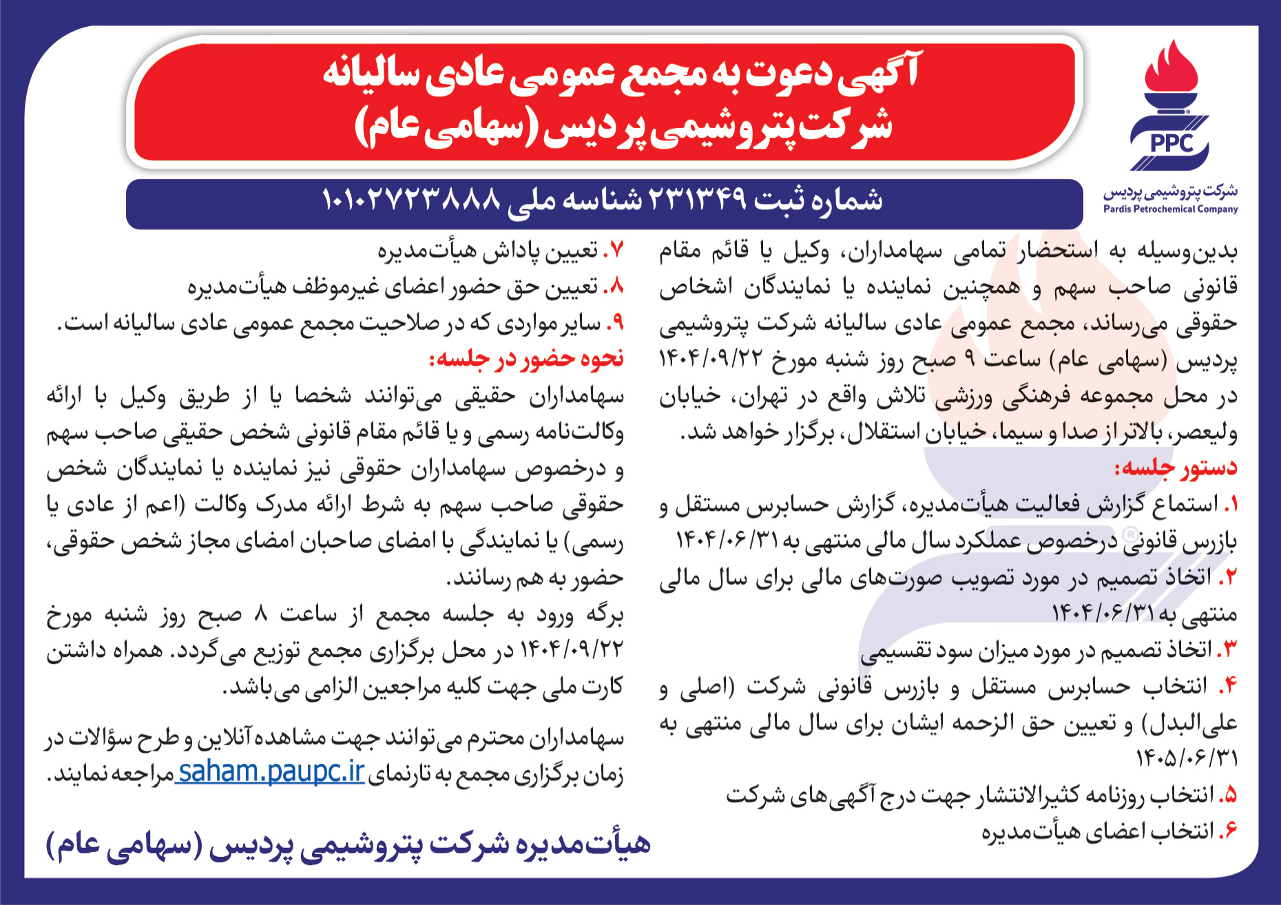 • آگهی دعوت به مجمع عمومی عادی سالیانه شرکت پتروشیمی پردیس (سهامی عام)