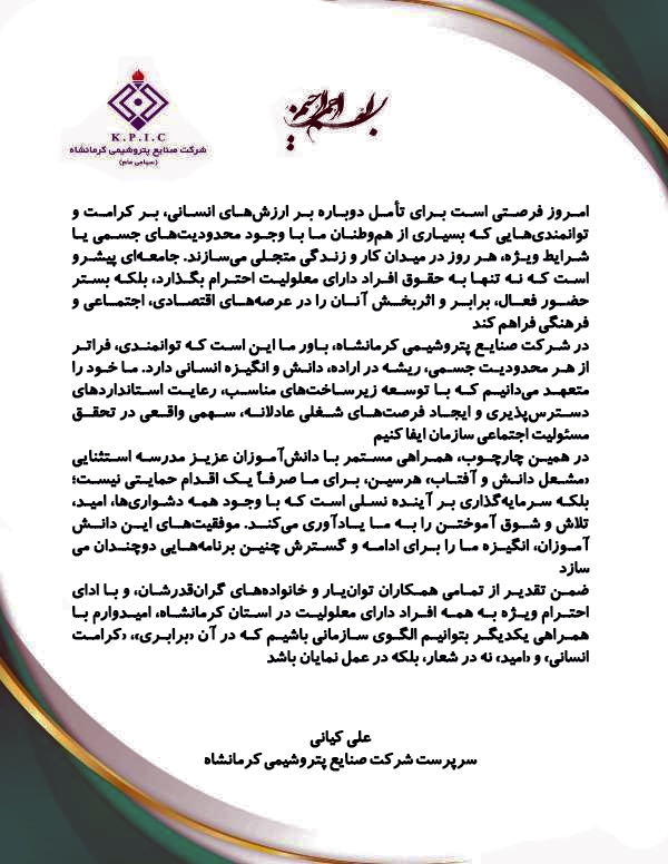 • پیام سرپرست شرکت صنایع پتروشیمی کرمانشاه به مناسبت نکوداشت روز جهانی معلولان