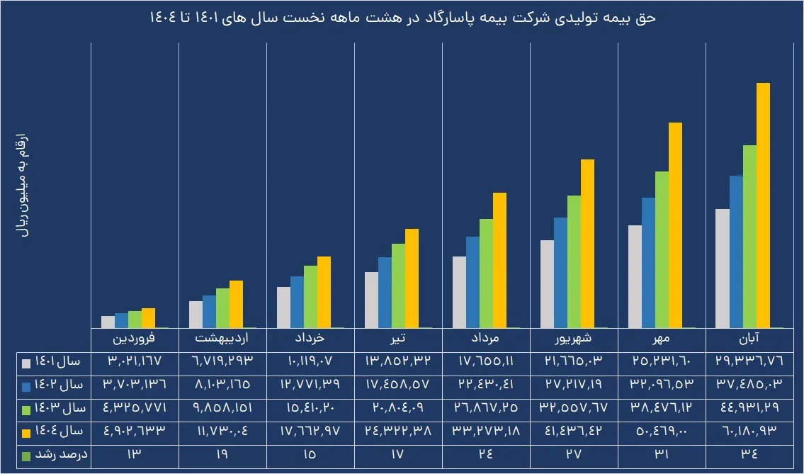 مرور عملکرد سال‌های ۱۴۰۱ تا ۱۴۰۴ نشان می‌دهد که اگرچه این رشته همواره در مسیر رشد بوده، اما سال ۱۴۰۴ نقطه اوج این روند است. در فروردین ۱۴۰۱، حق‌بیمه تولیدی حدود ۳ میلیون و ۲۱ هزار و ۱۶۷ میلیون ریال بود و در فروردین ۱۴۰۲ این رقم به ۳ میلیون و ۷۰۳ هزار و ۱۳۶ میلیون ریال رسید و رشدی حدود ۲۲ درصد ثبت شد. سال بعد نیز فروردین ۱۴۰۳ با ثبت ۴ میلیون و ۳۲۵ هزار و ۷۷۱ میلیون ریال، رشد نزدیک به ۱۶ درصدی را تجربه کرد. این روند در فروردین ۱۴۰۴ با رقم ۴ میلیون و ۹۰۲ هزار و ۶۳۳ میلیون ریال ادامه یافت و رشدی بیش از ۱۳ درصد را رقم زد.