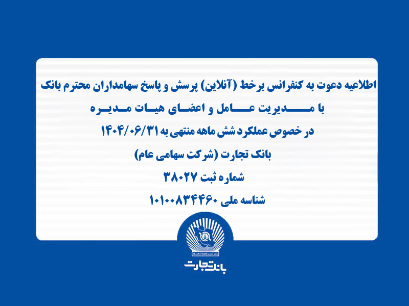 اطلاعیه دعوت به کنفرانس برخط (آنلاین) پرسش و پاسخ سهامداران محترم بانک با مدیریت‌عامل و اعضای هیات‌مدیره، در خصوص عملکرد شش ماهه منتهی به 1404/06/31 بانک تجارت (شرکت سهامی عام)