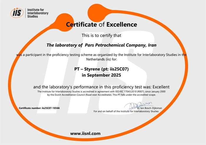 بر اساس گواهی صادره از سوی مؤسسه مطالعات بینآزمایشگاهی (IIS)، آزمایشگاه پتروشیمی پارس در آزمون مهارت PT – Styrene که در سپتامبر ۲۰۲۵ با مشارکت ۳۶ آزمایشگاه از ۱۸ کشور جهان برگزار شد، توانست عملکردی «عالی» از خود به ثبت برساند.