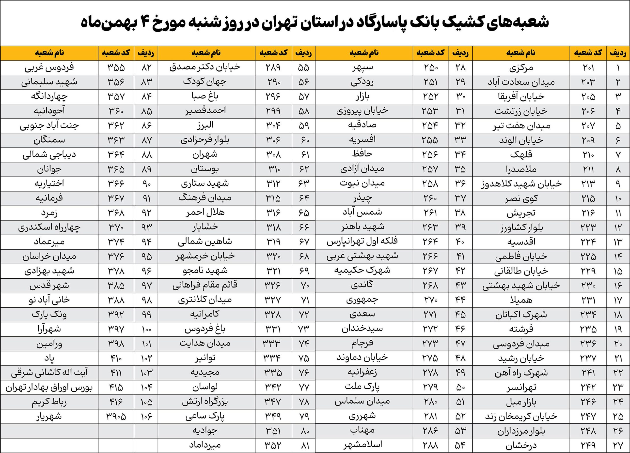 اعلام اسامی شعبههای کشیک بانک پاسارگاد در روز شنبه چهارم بهمنماه