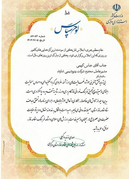 مهندس حسین عسگری معاون تولید و رئیس مجتمع پتروشیمی شازند به نمایندگی از مدیرعامل، لوح سپاس استاندار مرکزی را دریافت نمود.