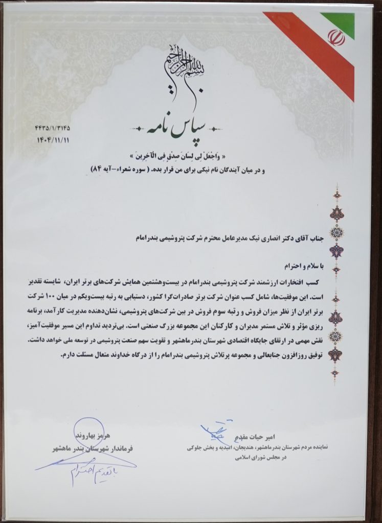 • اهدای لوح تقدیر فرماندار بندرماهشهر به پتروشیمی بندرامام به‌پاس افتخارات ملی و عملکرد شاخص