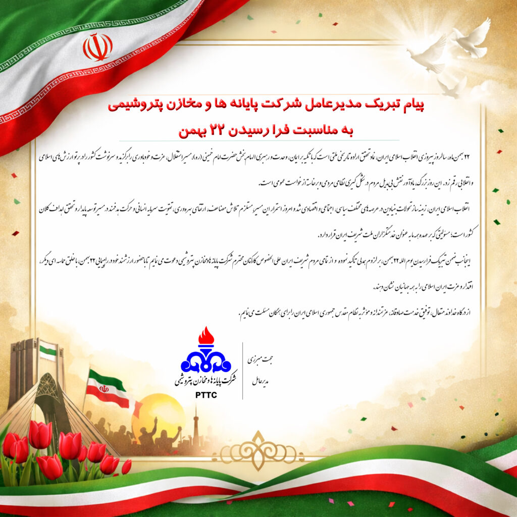 مدیرعامل شرکت پایانه ها و مخازن پتروشیمی در پیامی، فرارسیدن ۲۲ بهمن، سالروز پیروزی انقلاب اسلامی ایران را تبریک گفتند.