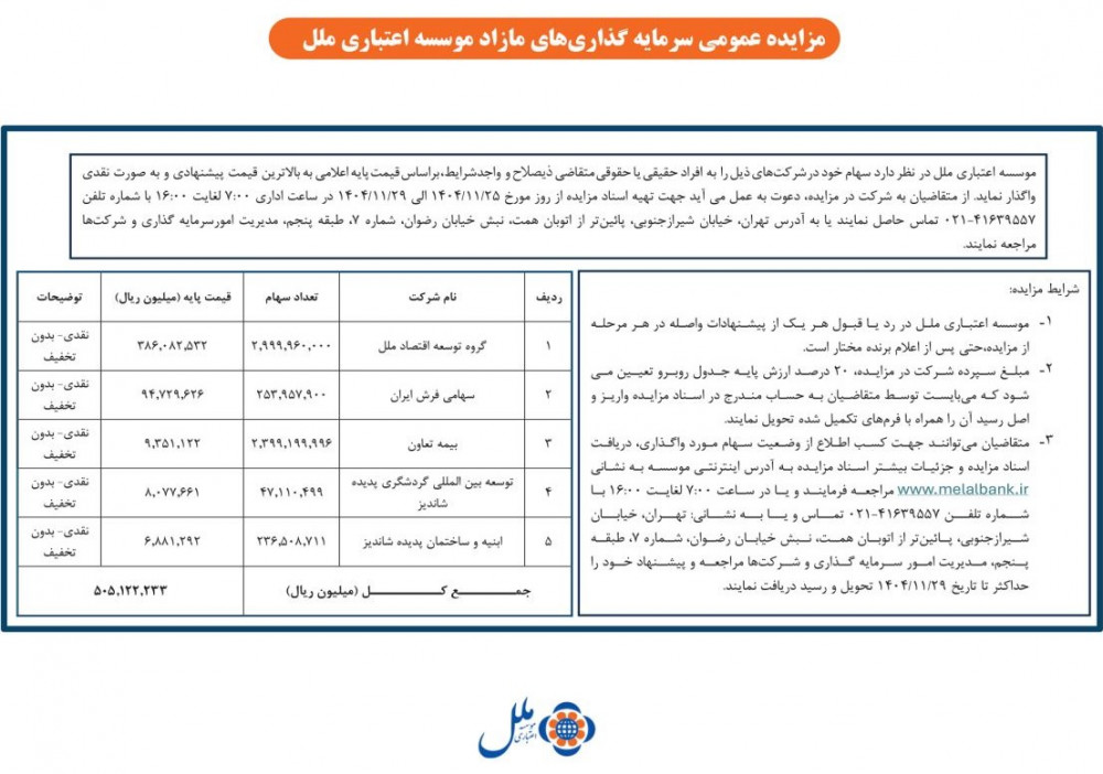 فرهنگ اقتصاد _موسسه اعتباری ملل در نظر دارد سهام خود در شرکتهای ذیل را به افراد حقیقی یا حقوقی متقاضی ذیصلاح و واجد شرایط بر اساس قیمت پایه اعلامی به بالاترین قیمت پیشنهادی و به صورت نقدی واگذار نماید از متقاضیان به شرکت در مزایده دعوت به عمل می آید جهت تهیه اسناد مزایده از روز مورخ ۱۴۰۴/۱۱/۲۵ الی ۱۴۰۴/۱۱/۲۹ در ساعت اداری ۷:۰۰ لغایت ۱۶:۰۰ با شماره تلفن ۰۲۱-۴۱۶۳۹۵۵۷ تماس حاصل نمایند یا به آدرس تهران خیابان شیراز جنوبی پائین تر از اتوبان همت نبش خیابان رضوان شماره ۷ طبقه پنجم مدیریت امور سرمایه گذاری و شرکتها مراجعه نمایند.