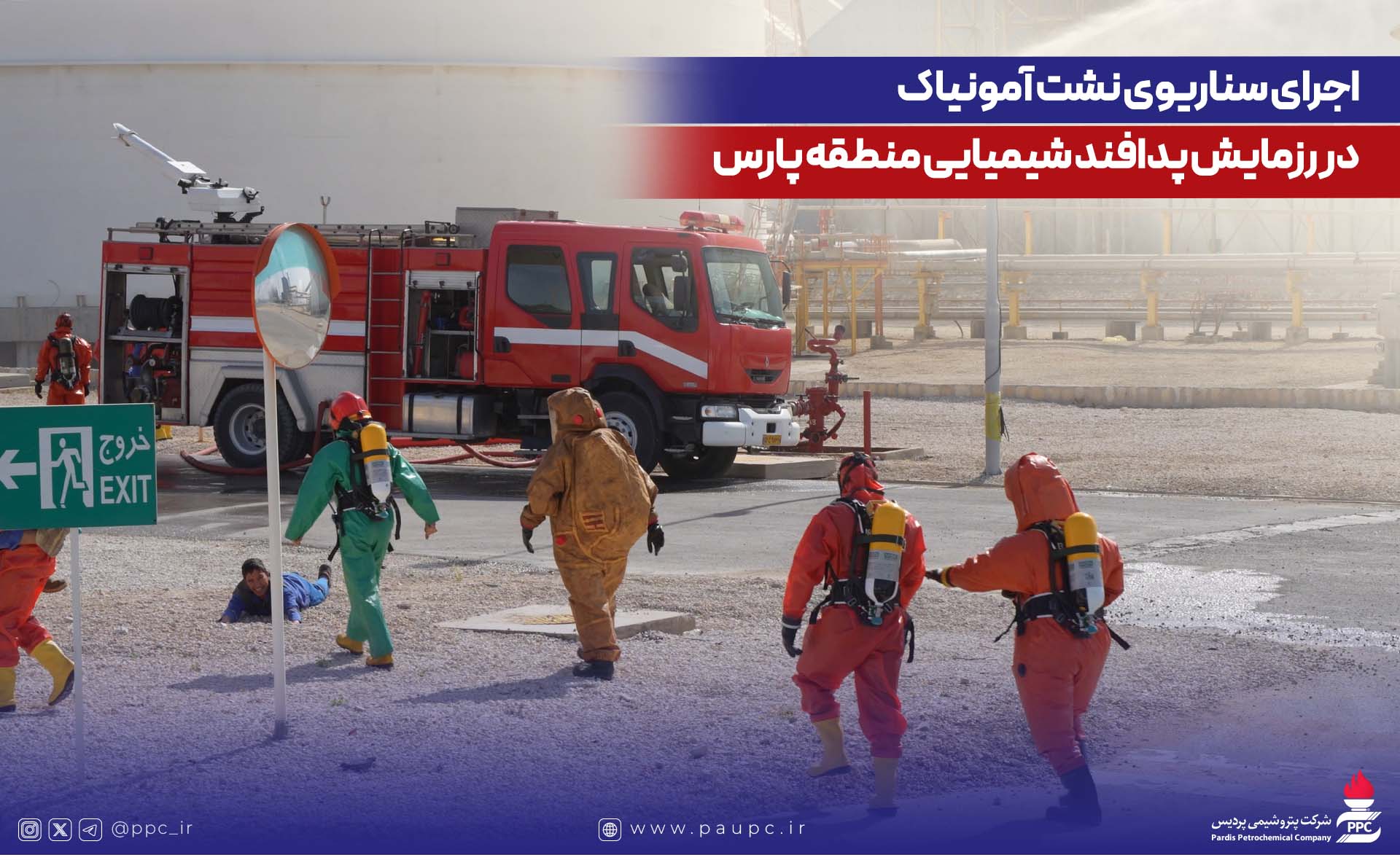 سناریوی نشت آمونیاک در مجتمع پتروشیمی پردیس، در قالب رزمایش بزرگ پدافند شیمیایی منطقه ویژه اقتصادی انرژی پارس با عنوان «سردار شهید ربانی»، صبح امروز با مشارکت صنایع پتروشیمی و دستگاه‌های امدادی منطقه اجرا شد.
