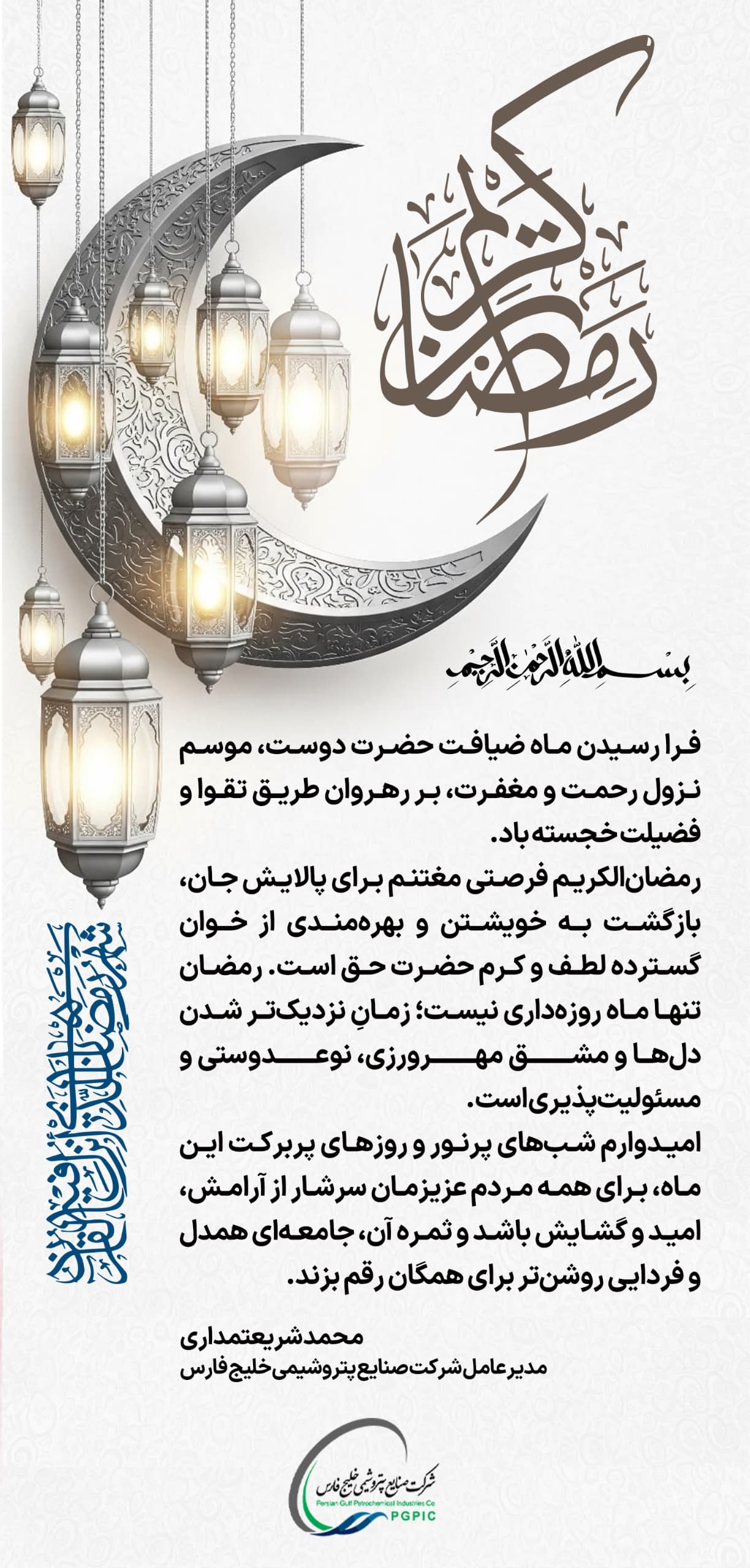 • پیام محمد شریعتمداری مدیرعامل گروه صنایع پتروشیمی خلیج‌فارس به مناسبت حلول ماه مبارک رمضان