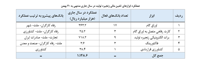 با اقدامات و تمهیدات بانک مرکزی جهت توسعه ابزارهای تأمین مالی زنجیره تولید، هدایت نقدینگی به سمت فعالیت های مولد اقتصادی و تسهیل تأمین مالی بنگاه های اقتصادی، میزان تأمین مالی بنگاه‌های اقتصادی از طریق ابزارهای نوین تأمین مالی زنجیره تولید در سال جاری (منتهی به 30 بهمن ماه) از 114 همت فراتر رفت. این در حالی است که در سال گذشته تنها ابزار تأمین مالی زنجیره تولید معرفی شده توسط بانک مرکزی اوراق گام بوده است که عملکرد آن در مقطع مشابه 8.7 همت بوده است.