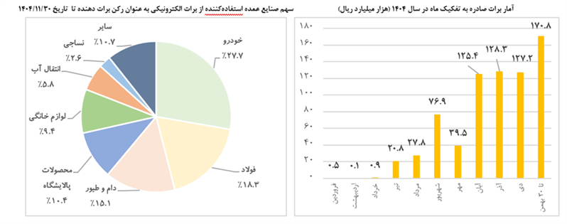 برات الکترونیکی زنجیره تولید از ابتدای سال جاری با قابلیت تأمین مالی سرمایه در گردش اشخاص حقیقی و حقوقی عملیاتی شده است. در حال حاضر ۱۰ بانک شامل بانک‌های صادرات ایران، سپه، صنعت و معدن، تجارت، ملی ایران، ملت، رفاه کارگران، سینا، شهر و پارسیان با دسترسی به زیرساخت مربوطه قادر به صدور برات الکترونیکی زنجیره تولید هستند. تأمین مالی از طریق این ابزار در سال جاری منتهی به ۱۴۰۴/۱۱/۳۰ مبلغ ۷۱۸.۲ هزار میلیارد ریال است که توسط ۹ بانک تجارت، صادرات ایران، ملت، سپه، ملی ایران، صنعت و معدن، رفاه کارگران، سینا و شهر صورت گرفته است. عمده استفاده از برات الکترونیکی زنجیره تولید جهت تسویه معاملات صورت گرفته در حوزه‌های مربوط به صنایع خودرو، فولاد، دام و طیور، محصولات پالایشگاهی، لوازم خانگی، انتقال آب، عمران و توسعه شهری، نساجی، مواد غذایی و پلاستیک است.